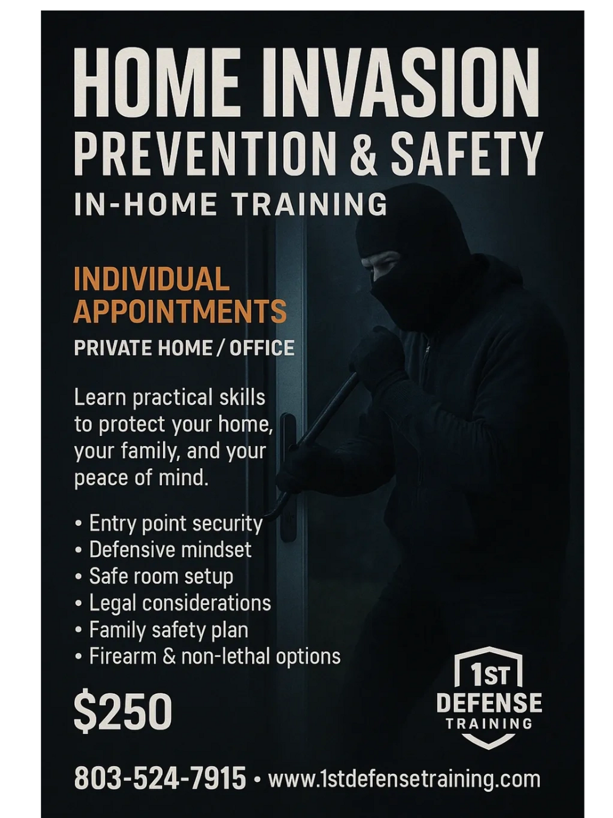 This one-on-one, private session brings professional security training right to you — in your own home or office. You’ll work directly with an instructor from 1st Defense Training to assess your space, identify vulnerabilities, and learn proven strategies to strengthen your security and emergency readiness.